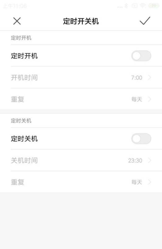 步骤1:开启定时开关机功能在定时开关机页面中,将“定时开机”和“定时关机”的灰色按钮滑动至蓝色,表示功能已开启。