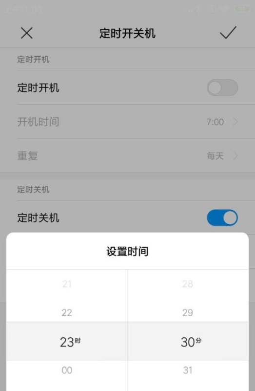 关机时间:点击“关机时间”,选择具体时间(如晚上23:00)。