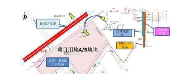 基坑止水帷幕体系:因紧邻地铁七号线,采用全封闭TRD工法水泥土搅拌墙(墙体总长832米、深度60-70米),有效降低对周边轨道及地下管线的影响,保障施工安全。