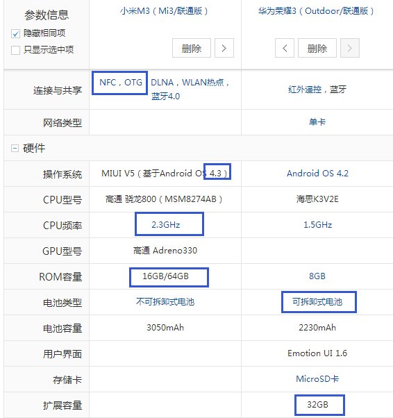 小米3在配置上比荣耀3好,小米3是安卓4.3系统,CPU频率以及rom容量都优于荣耀3,且支持NFC和OTG功能。缺点是不支持SD卡扩展。