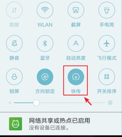 1、首先在手机从上往下滑动页面,出现通知栏,点击“快传”。注意:如果没有看到“快传”功能,那点击【开关排序】,把快传移动到显示开关上。