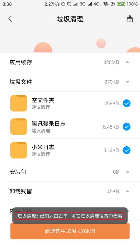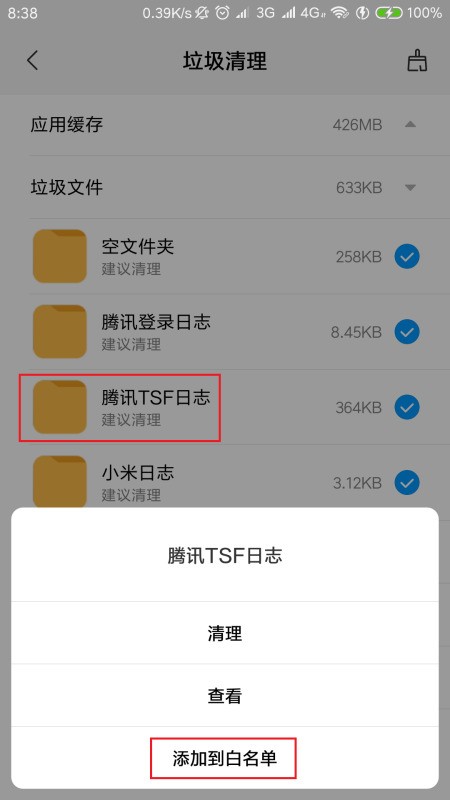 2、接下来,等待垃圾文件扫描完毕之后,点击选择要添加白名单的文件夹,在页面底部弹出的菜单中,选择“添加到白名单”按钮;