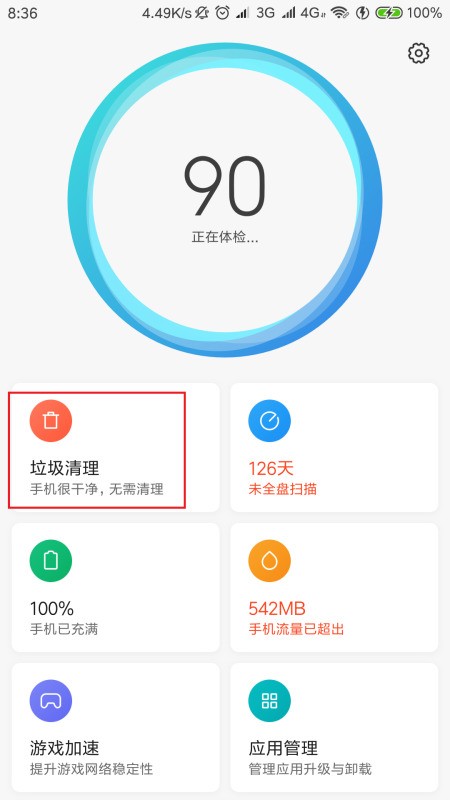 1、以MIUI 10系统为例,打开安全中心应用界面,点击页面中的“垃圾清理”菜单项;