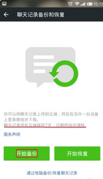 2、这里有两个选择,分别是“开始备份”和“开始恢复”,由于我们是要导出聊天记录,所以这里我们选择“开始备份”。ps:注意划红线的文字;