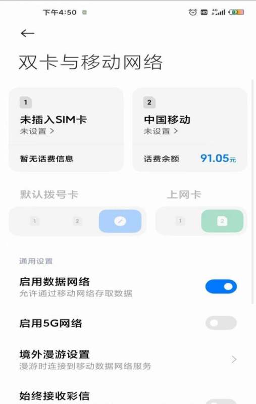 选择电话卡:在双卡与移动网络界面中,点击需要设置的电话卡(如卡1或卡2)。