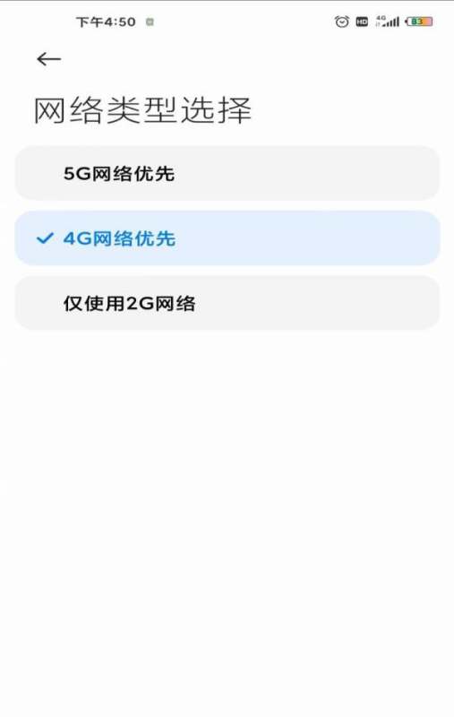 进入网络类型选择:在电话卡设置界面中,找到“网络类型选择”选项并点击进入。