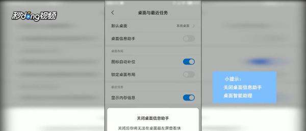 关闭桌面信息助手/智能助理开关:在“桌面与最近任务”页面中,找到“桌面信息助手”或“桌面智能助理”选项,点击其右侧的开关按钮,使其从开启状态(蓝色)变为关闭状态(灰色)。