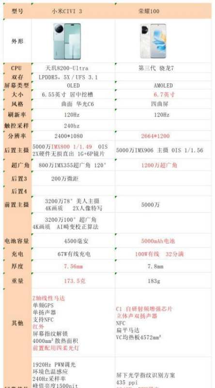 价格:小米civi3大约比荣耀100便宜300元左右。体型:小米civi3机身厚度为7.56mm,重量为173.5克;荣耀100机身厚度为7.8mm,重量为183克。小米civi3在体型上更为轻薄。三、总结