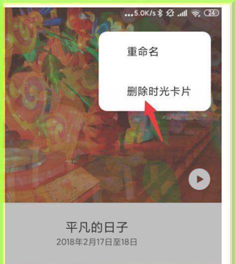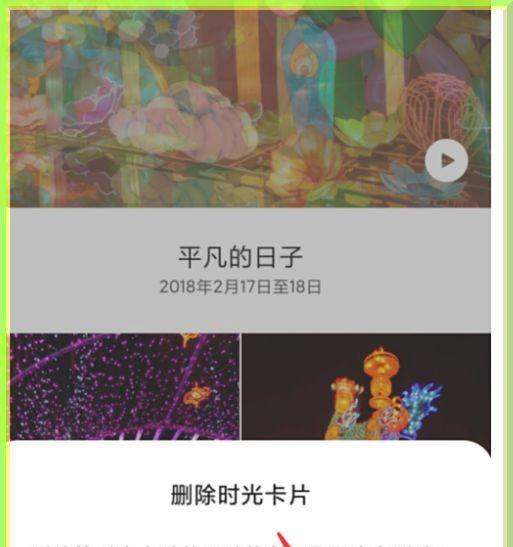 选择删除选项:在弹出的菜单中,找到并点击“删除时光卡片”(部分机型可能显示为“删除回忆”“删除此时光”等)。