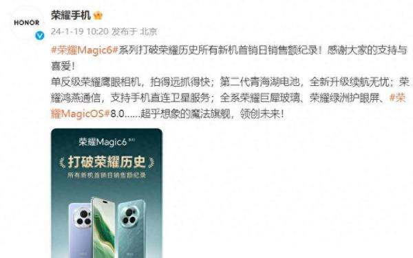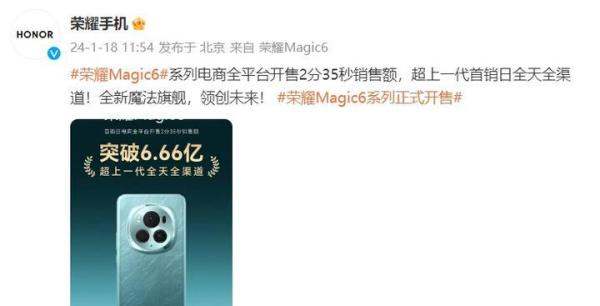 荣耀Magic6系列创造了销售纪录,开售2分35秒销售额突破6.66亿元,超越上一代荣耀Magic5系列首销日全天全渠道销量,并打破荣耀历史所有新机首销日销售额纪录。