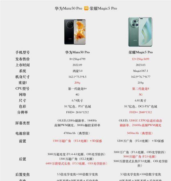 综上所述,荣耀Magic5 Pro在处理器性能、续航能力、屏幕素质和拍照能力等方面都优于华为Mate50 Pro。再加上荣耀Magic5 Pro支持5G网络这一巨大优势,使得它在当前市场上更具竞争力。因此,对于想要购买旗舰手机的用户来说,荣耀Magic5 Pro无疑是一个更值得选择的产品。
