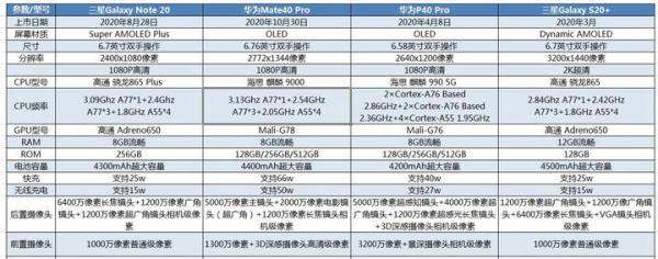华为mate40pro、P40pro、三星Note20、S20+四个型号手机性能比较和推荐