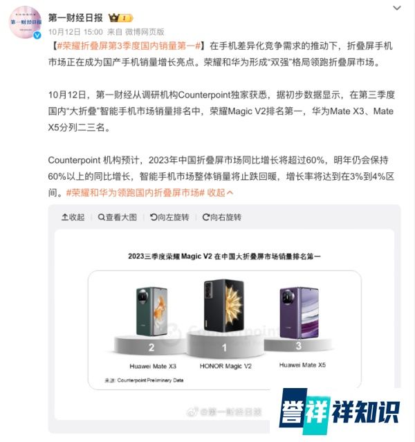 Counterpoint数据显示,第三季度国内“大折叠”智能手机市场销量排名中,荣耀Magic V2排名第一,华为Mate X3、Mate X5分列二三名。