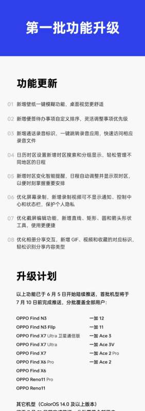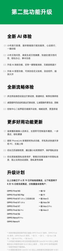其它机型 (ColorOS14.0 及以上版本) 将于 7 月 31 日前完成推送,分批覆盖全部用户。
