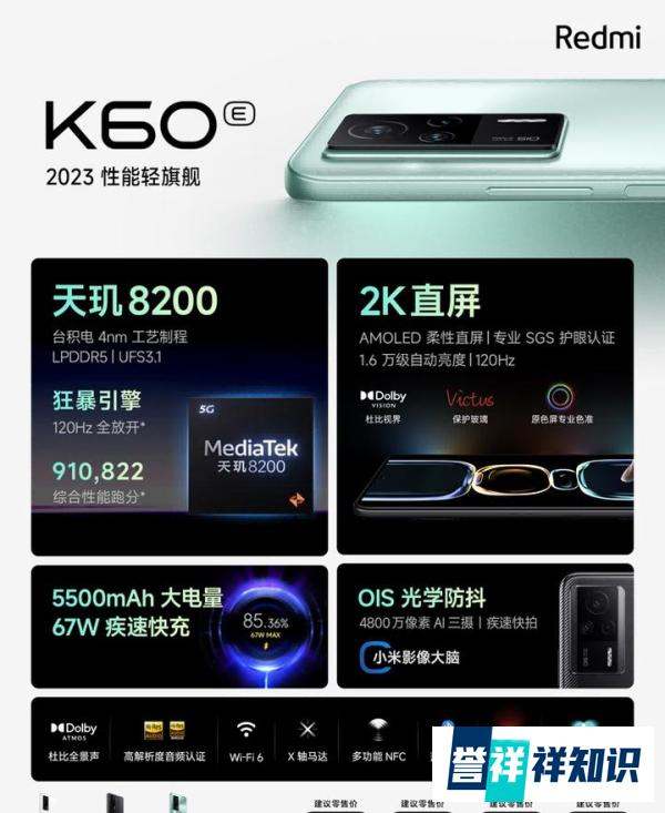 屏幕与Pro款相同:同样采用6.67英寸2K国产屏,在显示效果上与Pro款保持一致,为用户提供了出色的视觉体验。充电续航表现不错:5500mAh电池,支持67W有线快充 + 30W无线充电。大容量电池保证了较长的续航时间,快充和无线充电功能也方便用户随时为手机充电。价格相对亲民:起售价比Redmi K60 Pro低800元,对于预算有限,对性能和拍照要求不是特别高的用户来说,是一个性价比很高的选择。Redmi K60E:性能轻旗舰,预算友好处理器性能尚可:搭载联发科天玑8200处理器,配合LPDDR5内存和UFS 3.1闪存。能够满足日常的基本使用需求,运行一些常见的应用和游戏也能保持流畅。