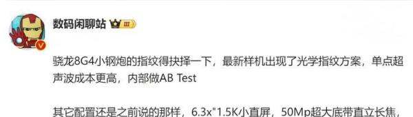 指纹方案测试情况:博主@数码闲聊站爆料称,“骁龙8G4小钢炮”最新样机正在测试光学指纹方案,由于单点超声波指纹成本较高,内部正进行AB测试以决定最终方案。虽然没有明确机型信息,但推测可能与小米15系列有关,暗示该系列可能放弃单点超声波指纹技术以平衡成本。