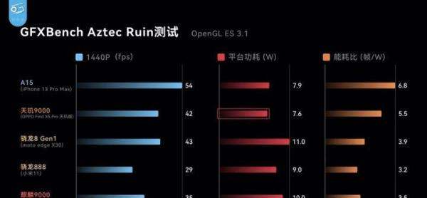 GPU性能与功耗:在Aztec Ruin 1440P OpenGL测试中,天玑版帧率达42帧,功耗仅7.6W,优于骁龙8 Gen1;在《光明山脉》测试中,天玑版初始帧率接近50帧(接近A15水平),5分钟后降频至30帧以下,功耗降至5.2W,与865性能持平但功耗更低。