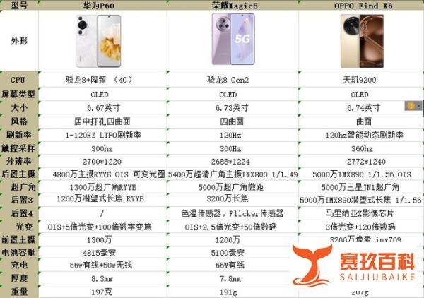 自拍:OPPO Find X6的3200万IMX709超感光猫眼镜头自拍最精致,华为P60前置为1300万像素,荣耀Magic5为1200万像素,均不及OPPO Find X6。细节配置三款手机都采用立体双扬声器,同样支持多功能NFC、红外遥控。荣耀Magic5采用Z轴马达,华为P60和OPPO Find X6采用X轴马达,后两者振感反馈更强烈。华为P60支持IP68防水,是全球首款支持双向北斗卫星消息的智能机,无地面网络时可对外发送信息和位置,并进行接收和回复。体型荣耀Magic5:重191克,厚7.8毫米,比华为P60轻6克、薄0.5毫米,比OPPO Find X6轻16克、薄1.16毫米,握持手感最轻薄舒适。华为P60:整机重量为197克,厚度是8.3毫米。OPPO Find X6:重207克,厚8.96毫米。优势总结华为P60:支持50瓦无线充电、双OIS防抖的相机组、最高级别IP68防水、双向北斗卫星消息、鸿蒙系统。荣耀Magic5:骁龙8Gen2处理器+5G网络、屏幕最护眼、续航最持久、手感最轻薄。OPPO Find X6:同属第一梯队的天玑9200处理器、支持5G、自拍最精致、充电速度最快。