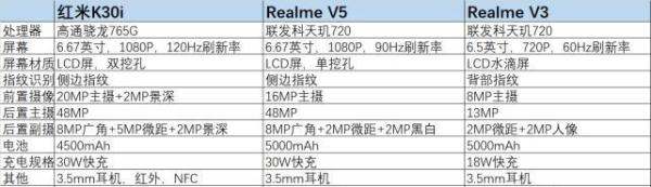 Realme V3:采用天玑720处理器,720P分辨率屏幕,6 + 128GB价格1399元,明显不是红米K30i的对手。Realme V5:采用天玑720处理器,90Hz高刷屏,6 + 128GB到手价格1399元。与红米K30i相比,在处理器、屏幕刷新率和周边配置上存在一定差距,红米K30i更值得购买。