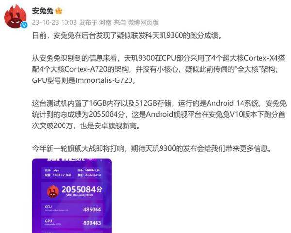 联发科天玑9300安兔兔跑分突破205万,其性能表现可从以下方面分析: