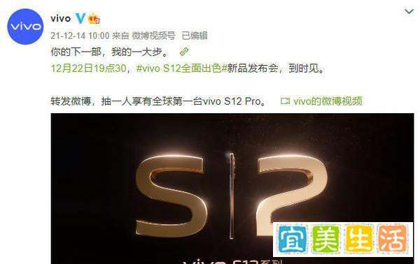 vivo S12系列新品发布会将于12月22日19:30举行,包含vivo S12和vivo S12 Pro两款机型,搭载优化版天玑1200芯片。