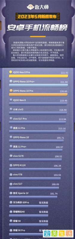 5月新机流畅榜和性能榜的榜首机型均为iQOO Neo8 Pro,这一结果符合预期,主要得益于其核心配置、外围优化及系统表现的综合优势。 以下为具体分析: