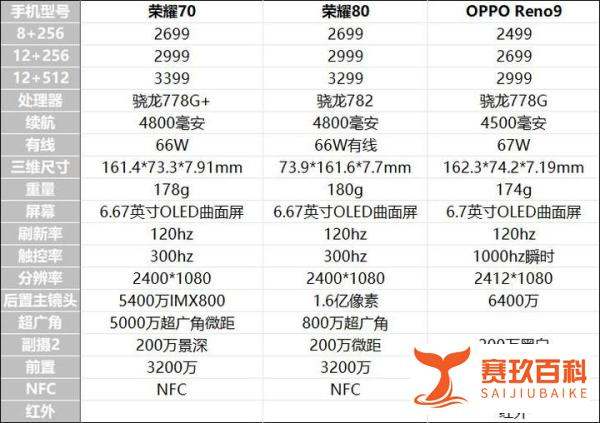 其余配置方面屏幕:三款机型都是OLED曲面屏,支持120Hz刷新率和高频PWM调光,屏幕尺寸也差不多,屏幕护眼效果方面差异不大。续航&快充:都支持66/67W有线快充。OPPO Reno9内置4500毫安电池,荣耀70和荣耀80内置4200毫安电池,OPPO Reno9续航能力稍强,荣耀70和80续航能力稍弱一些。手感:OPPO Reno9重174克,厚7.19mm;荣耀70重178克,厚7.91mm;荣耀80重180克,厚7.7mm。OPPO Reno9机身最轻盈,这与它电池略小有一定关系。其他:三款机型都支持NFC功能,只有OPPO Reno9支持红外遥控。