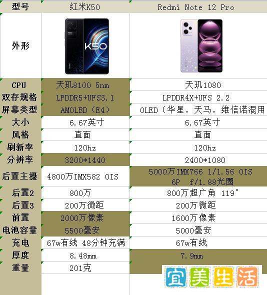 后置主摄:红米Note12pro后置主摄为5000万像素,采用IMX766传感器,感光面积为1/1.56英寸;红米k50的4800万IMX585传感主摄,感光面积为1/2英寸,相比之下红米Note12pro后置拍照更优秀。体型更轻薄:红米Note12pro轻14克,薄0.58毫米,对于喜欢轻薄手机的用户来说,握持感更好。耳机:红米Note12pro保留了3.5mm独立耳机插孔,使用方便,而红米k50为充电耳机二合一的Type - C接口。红米k50的优势性能铁三角:红米Note12pro由天玑1080处理器 + LPDDR4X + UFS 2.2组成,性能跑分成绩在52万左右;红米k50的天玑8100测试成绩高达85w +,且使用规格更高的LPDDR5运存和UFS 3.1闪存,性能体验更强劲,无论是日常使用还是运行大型游戏都更加流畅。屏幕素质更高:红米Note12pro为普通OLED屏,2400 * 1080分辨率,240Hz触控率,900nit亮度;红米k50则是三星E4,2K分辨率,480Hz触控率,1200nit亮度,屏幕材质、分辨率、触控率、亮度都要好于红米Note12pro,能带来更清晰、流畅的视觉体验。前置自拍:红米Note12pro前置为1600万镜头,红米k50用的是2000万镜头,像素略高一点,自拍效果更清晰。电池:红米Note12pro电池容量为5000毫安,红米k50是5500毫安,比前者多500的容量,续航更持久。总结红米Note12pro的优势:1920Hz高频调光、5000万IMX766主摄、3.5mm耳机孔、轻14克、薄0.58毫米、便宜100元。红米k50的优势:天玑8100处理器、LPDDR5 + UFS 3.1双存、三星E4 2K屏、480Hz采样率、1200nit亮度、前置2000万自拍、5500毫安电池。
