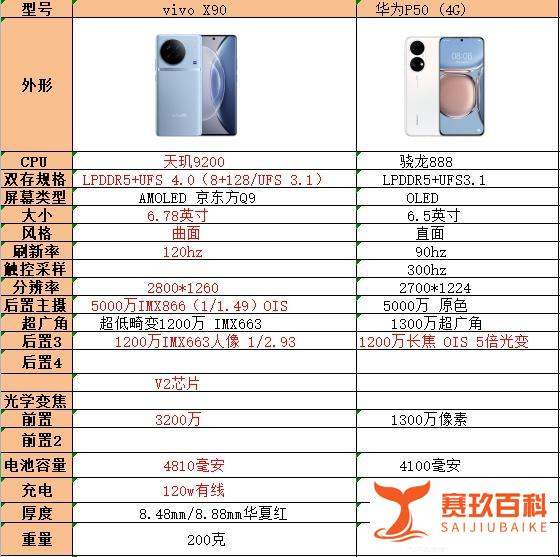 续航与充电:内置4810mAh电池,支持120W快充;华为p50为4100mAh电池+66W快充,续航和充电速度均落后。其他细节:X轴马达振感更好,支持5G网络,价格比华为p50(8+128G)便宜189元。华为p50的核心优势长焦拍摄:支持5倍光变和80倍数码变焦,适合远景拍摄需求。机身小巧:厚度7.92毫米,重量181克,比vivo x90(8.48/8.88毫米,200/196克)更轻薄,握持感更佳。防水等级更高:支持IP68防水,优于vivo x90的IP64。直板屏设计:6.5英寸直屏,适合偏好直屏的用户。相同点均支持NFC和红外遥控,采用立体双扬声器。总结与推荐建议选vivo x90的情况: