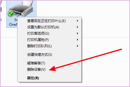 2、然后在弹出来的窗口中右键单击正在连接的打印机,选择“删除设备”。