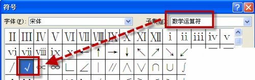 第四步,单击“更改”之后,会弹出“符号”对话框,选中“子集”的“数学运算符”下面的“√”,确定。