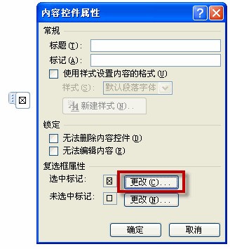 单击“复选框属性”的“选中标记”右边的“更改”按钮,对符号进行更改,比如我们需要的是勾而不是叉。