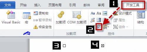 第一步,单击“开发工具”——“控件”——“复选框内容控件”,word会自动在当前光标位置插入一个复选框控件,如下图第三标识的。