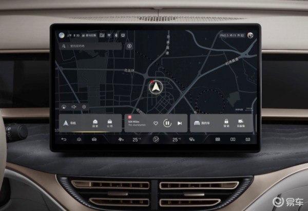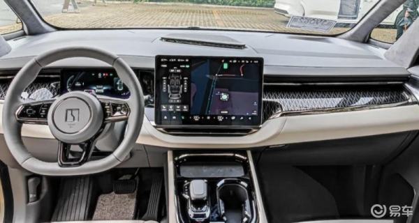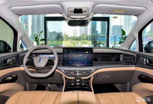 腾势D9采用简洁明快的设计思路,同样也突出了科技感出岁,方向盘为双辐式设计,水晶挡把与周围功能按键结合,前方为无线充电面板。新车配备了17.3英寸悬浮式中控燃屏,后排还配备娱乐系统+扶手屏、HUD抬头显示,可实现全车7屏互联。