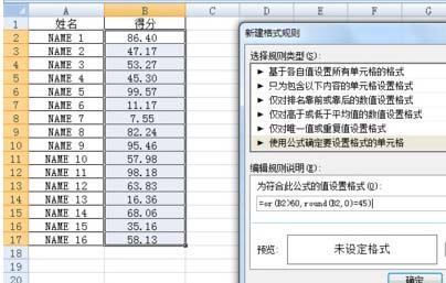 9、再举个例子,找得分中大于60分或经过四舍五入到整数以后等于45的单元格,将其填充出来,跟上面的一样步骤,只不过公式的地方发生变化,输入=or(B2>60,round(B2,0)=45)