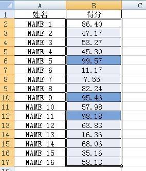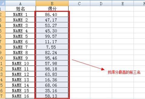 2、以下面这组数据为例,将其得后迫皮甚述翻武眼分最高的前三名通过条件格式功能填充颜色凸显出来。