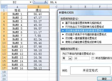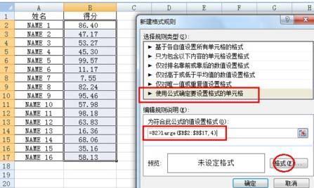 6、看到图中第六项“使用公式确定要设置格式的单元格”,点击以后在下方的横框中输入=B2>large($B$2:$B$17,4),再点击格式。