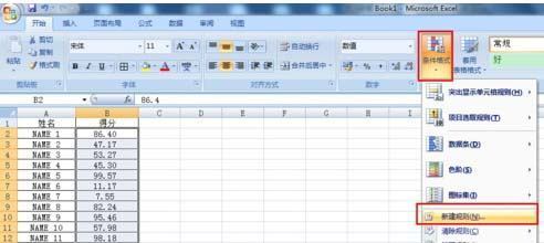 4、在excel开始菜单栏中点击条件来自格式下方的倒三角,点击新建规则。