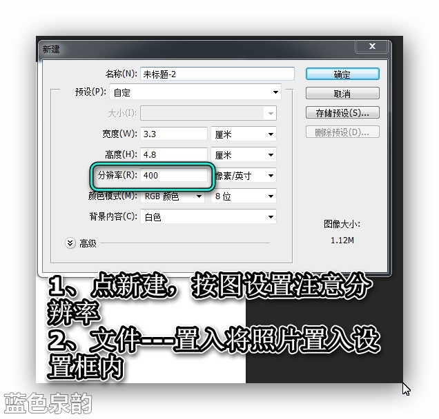 2、打开新建文档的界面,点击新建按钮,弹出新建文档对话框,再设置宽度为3.5厘米;高度为5.3厘米,分辨率为300;背景为白色;再点击确定。