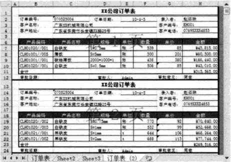 光标置于代码中任意位置,并按F5键执行,程序会将“订单表”复制一份,且转换成下图所示的样式,不仅每页仅有4行明细数据,且每页都具有单独的合计及相同的顶端标题和底端标题。最能体现便利性之处在于程序已将工作表自动分页,每12行为一页,不再需要调整页面设置,直接调用针式打印机打印程序即可。