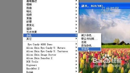 显示并选中“图层1副本”,执行【杂色】→【中间值】滤镜,半径为4像素。