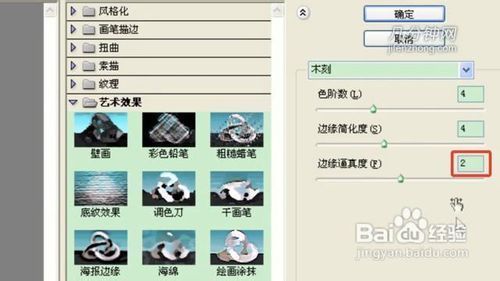 执行【艺术效果】→【木刻】滤镜,色阶数为4,边缘简化度为4,边缘逼真度为2。然后把图层混合模式改为“强光”。