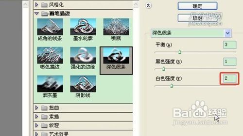 执行【画笔描边】→【深色线条】滤镜,平衡为3,黑色强度为1,白色强度为2。然后将图层混合模式改为“滤色”,不透明度60%。