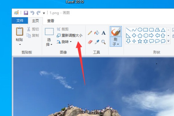 3、在画图软件最上方图像选项卡上根尔千参球守有一个重新调整图片大小选项。我们点击选择它。可以看到就蹦出来一个设置图片大小的对话框。