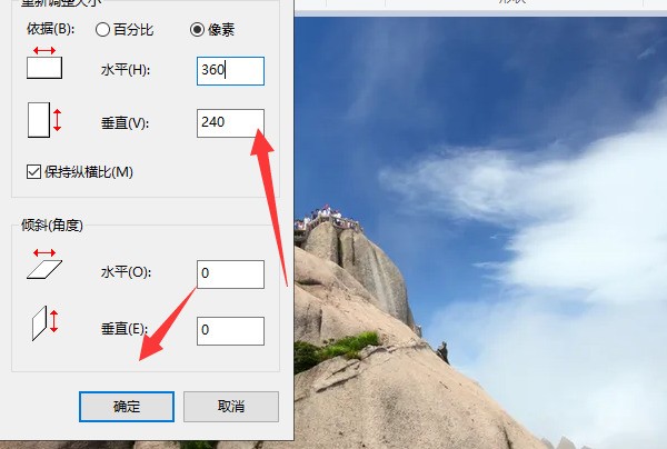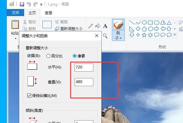 6、这个时候我们就把保持图片纵横比这个勾选的选项取消掉,然后再按照自己的需求输入这个尺寸就可以了。设置完管刚岩较成以后点击确定就可以完成图片尺寸的修改,返回到画图软件保存就可以了。