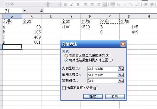 excel高构将按哪利而古军木村级筛选中,把大于100小于50来自0的数据,复制到制定区域