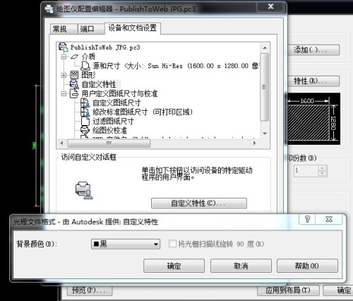如果是打印到文件的话 可以去修改打印机的特性 比如用JPG打印 那么就先选择好JPG打印机 然后点击右边的特性 然后在弹出的对话框里面选择自定义特性 然后点击下面的自定义特性 然后在弹出的对话框里面选择背景颜色就可以了 但是要注意 默认图纸上面白色的会打印成黑色 所以有可能会一片漆黑 要调整一下物体的颜色 最好改成彩色的