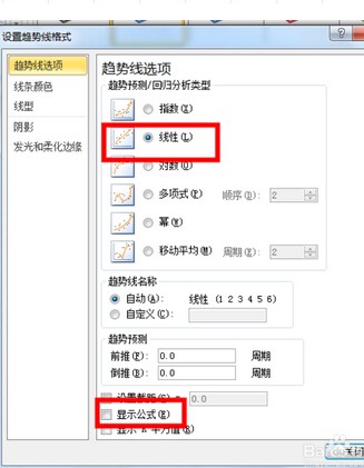 5.点击确定即可出现曲线图,右击曲线图,点击添加趋势线,在弹出的对话框中选择线性和显示公式,点击确定。