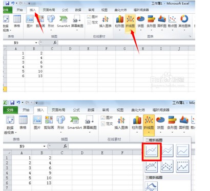 2.点击“插入”,找到“折线图”,选择第一项,折线图