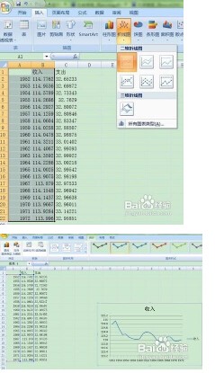 有表如下图,做出来自以年份为X轴,收入支出为左边和右边的Y轴,1、做出关于年份和收入的折线图,策它县过赵本厂极控步骤如下图,结果如促易下图:
